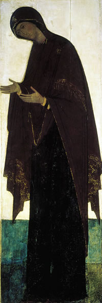 Esta cor é também produto da combinação de vários outras como o vermelho, o azul, o branco e o negro. É a cor da terra. Portanto, na iconografia essa cor aparece no rosto de diversas figuras para recordar que «vieste do pó e ao pó retornarás». Significa também humildade, pois esta palavra vem do latim "humus", que significa terra. É por esse motivo que o hábito dos monges tem essa cor. Ouro, branco, negro, vermelho, púrpura, azul, verde e marrom são as únicas cores que podem ser usadas na pintura dos ícones. O uso de outras combinações de cores estava fora de toda regra iconográfica, pois não contém nenhuma simbologia. A figura humanaA partir da Grécia clássica, a arte ocidental pretendeu exaltar a beleza da figura humana. Na Atenas de Péricles, para a elaboração das obras de escultura, eram escolhidos os modelos que eram arquétipos da beleza e perfeição anatômicas, para, dessa forma, estabelecer as proporções perfeitas para cada parte do corpo humano. O Renascimento retomaria depois os ideais da estética grega. A pintura de tradição bizantina difere radicalmente desse conceito, que se baseia na beleza física. Nos ícones a figura humana apresenta uma carência total de realismo, pretendendo antes de tudo transmitir uma mensagem espiritual através dessas pinturas, posto que a beleza interior tem primazia sobre a estética, pois o ícone pretende somente cumprir com sua função evangélica. A Cabeça HumanaNos ícones, a cabeça não mantém nenhuma proporção com o resto do corpo, pois nela reside a inteligência e a sabedoria, assim também é a receptora das luzes de Deus. A cabeça feminina sempre é representada coberta por um manto ou algum outro toucador, ocultando completamente os cabelos. Em ícones do Menino Jesus e de alguns santos, como São Nicolas e São Basílio, suas cabeças são representadas em tamanho muito maior em relação ao corpo, significando serem detentores de uma inteligência superior inspirada pelo Espírito Santo. As cabeças de Cristo, da Virgem (Teothokos), anjos e santos se encontram sempre rodeadas de um «nimbo», uma auréola geralmente dourada, que representa a «Luz de Deus». O rostoO rostro das imagens é o centro espiritual do ícone. Estes rostos são representados quase sempre frontalmente, pois a frontalidade significa presença e dessa maneira tem um contato direto em relação a quem observa. Se encontram sempre em atitude de oração, já que seu pensamento está posto no altíssimo e parecem igualmente estar interrogando permanentemente quem se aproxima. Algumas vezes os rostos se encontram em uma posição de «três quartos», quer dizer, se dirige até o centro do motivo principal do ícone. Entretanto, sua vista permanece voltada para frente. Este é o caso de alguns ícones representando a Virgem, cuja cabeça está direcionada para o menino Jesus, mas seu olhar está voltado àqueles que o observam. Outro ícone com essas características é São Lucas em seu estúdio de pintor. Sua cabeça está voltada para seu trabalho, mas seu olhar está direcionado à frente. Estas disposições foram expressamente fixadas pelo «Manual Herminio», que atualmente se encontra resguardado em algum monastério, no Monte Athos. Alguns rostos são representados de perfil e sua explicação iconográfica seria a de que os personagens representados não alcançaram a santidade. Um exemplo disso é o chamado ícone da «Natividade», em que os rostos dos pastores adotam essa posição. A iconografía rechaça terminantemente pintar-se a parte posterior do rosto, isto é, a nuca. Na Grécia Clássica, chamavam os escravos de «aprosopos», que significa «os sem rosto». Em um ícone de São João Batista se pode ver sua cabeça arrancada do próprio corpo, mas seu rosto é perfeitamente visível. Esta simbologia se baseia em um versículo do Evangelho de São Lucas que diz «aquele que por a mão no arado e olhar para trás não é digno do Reino de Deus». Muito se falou acerca da repetição de modelos de rostos nos ícones, que tem quase o mesmo feitio. A explicação para isso se dá sem nenhum demérito, pois significa que uma vez que o homem passa a ser «o homem novo» de que fala São Paulo, e que recebeu a Graça Divina, para os olhos de Deus não existe diferença alguma entre seus filhos. As partes do rostoOs olhosOs olhos das figuras que aparecem nos ícones são extremamente grandes e se encontram marcados por sobrancelhas muito arqueadas. Comparando-os com o tamanho da cabeça estão completamente fora de proporção rompendo as medidas antropométricas, assim como também as medidas acadêmicas establecidas pela arte ocidental. Os olhos, como todos os órgãos sensoriais do rosto, levam implícito um símbolo baseado no texto evangélico de São Lucas que textualmente diz: «meus olhos hão visto tua Salvação». Esses olhos parecem sempre estar imóveis, entretanto, não somente vigiam e interrogam, como penetram até o mais profundo da alma do espectador. Os iconógrafos, ao pintá-los dessa forma, pretendiam revelar a Verdade, pois nesses olhos de tamanho descomunal, seguem ao pé da letra o indicado pelo Evangelho: «Teu olho é uma lâmpada. Se teu olho é luz, tudo em ti será luz, porém se teus olhos forem trevas, que grandes trevas serão.» O NarizÓrgão olfativo e início das vias respiratórias, e nos ícones se apresenta de forma muito estreita e comprida, quase como um filamento que une os olhos à boca. É pintado dessa maneira para impedir o acesso ás fragrâncias do mundo material e captar apenas o olor do sagrado, servindo de condutor ao hálito do espírito, que deve inundar todo o ser do personagem representado no ícone. A BocaAlguns filósofos gregos afirmavam que a boca é a parte mais sensual do corpo. Nela habita os sentidos do gosto que permitem saborear os mais sofisticados manjares e evitar os que causam mal estar. Dela brotam as palavras que louvam ou insultam. Com 