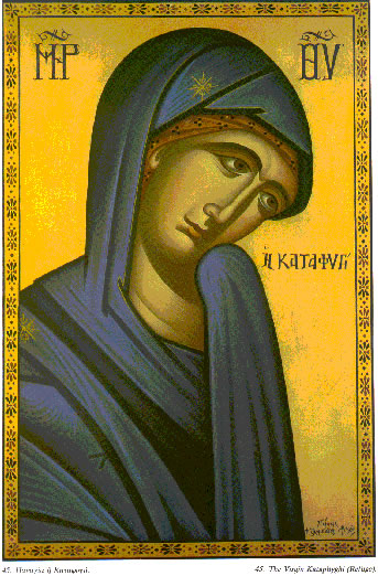 Representada junto com Jesus menino, que tem em suas mãos um pergaminho ou o Livro da Lei. HodigitriaSozinha e de pé, representa Maria, enquanto a condutora de almas. Hodigitria significa aquela que indica o caminho. Tem um dos pés à frente como se indicasse o movimento da caminhada. É interessante a «transferência de função» entre as figuras da religiosidade cristã e a de outras religiões consideradas pagãs, pois essa função de «condutor de almas» é atribuida na mitologia grega à figura de Hermes, deus dos viajantes e comerciantes. Representado com um cajado, símbolizando a caminhada, Hermes é também conhecido como o deus de ligeiros pés, pois ostenta asas neles. Kiriotissa